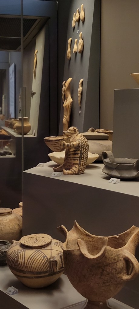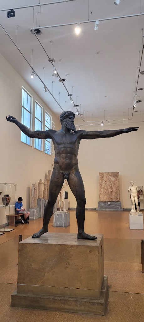 We started the bright and early at the National Museum of Archeology, which acts as a hub for artifacts from all over, rather than being dedicated to a specific movement or region. It houses many iconic objects that we have seen in our textbooks, such as the Artemision Bronze which was incredibly surreal to see for many of us. To be able to see monuments and sculptures that most of us have been studying for over a year feels life changing to say the least, but it also still feels like we are still not seeing the real things, as it is difficult to comprehend that these things were truly used and made centuries ago. Something that stuck out to me (other than the Cycladic hedgehog) is the difference between the Acropolis Museum which we visited yesterday and the National Museum. While the Acropolis Museum is dedicated to a specific site and follows a theme throughout, the National Museum sometimes places things together that have nothing to do with each other chronologically. I think that while some people might not like this, having different things together blurs the lines between cultures and shows how different groups often have the same ideas. For instance, there was a display of numerous iron tools and items from many groups of people, but somehow, they all followed a common thread; we as humans are often very unoriginal in our creations of tools. Another difference in these two museums can be seen in the way they treat the pieces. At the National Museum everything feels very “art historical”, many of the pieces seem like they stand on their own, even though they are sometimes placed in categories, such as “Hellenistic” or “classical”. The Acropolis Museum the other hand felt like there was a cohesive story to be told, but that was likely because it all came from the same site. Much like the Acropolis Museum, many of the other museums we will be visiting will be dedicated to the regions in which they live. Naturally we are all very excited for this, and to be exposed to all of the Greek culture that we can get our hands on (even if sometimes this culture provides very stressfully slow restaurant service)