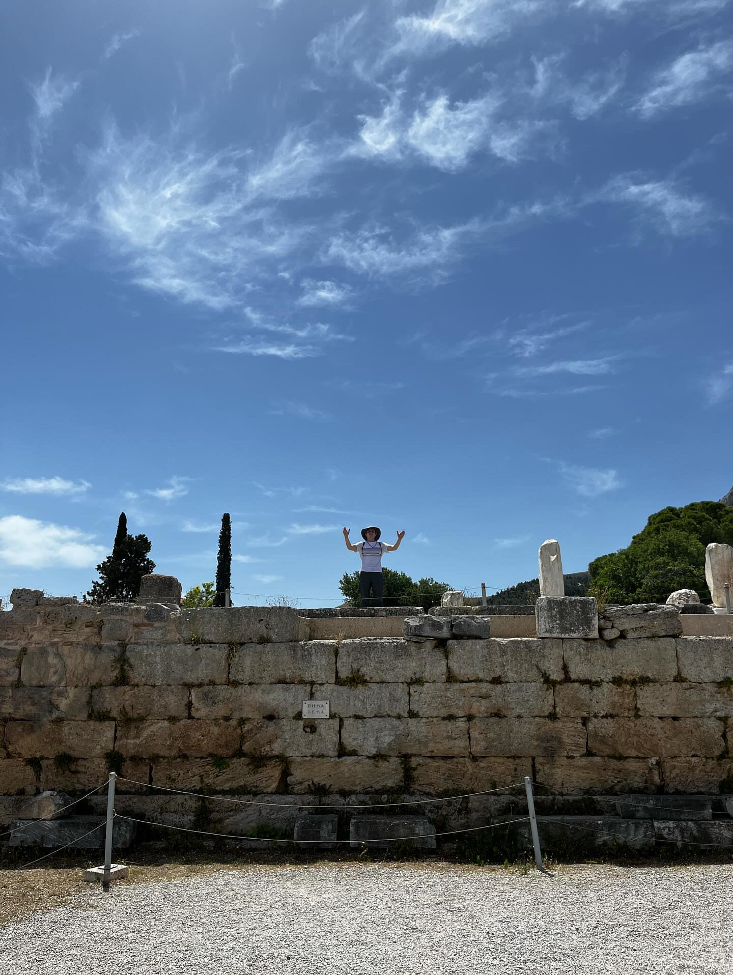 Cat then gave her informative presentation on The Temple of Apollo. The site has a long history of being associated with other Greek divinities, and as Cat told us in her presentation, the temple was dedicated to remains an active topic of debate. Built on the remains of an older temple, only seven columns stand of an original 38. Another one of the sites that we saw was where Glauce, the princess of Corinth, became Medea’s victim. After putting on a poisoned robe, she threw herself into a fountain, where she died. Today we saw the remains of said fountain. After the morbid thoughts, we took a group photo and a striking photo of Charles.