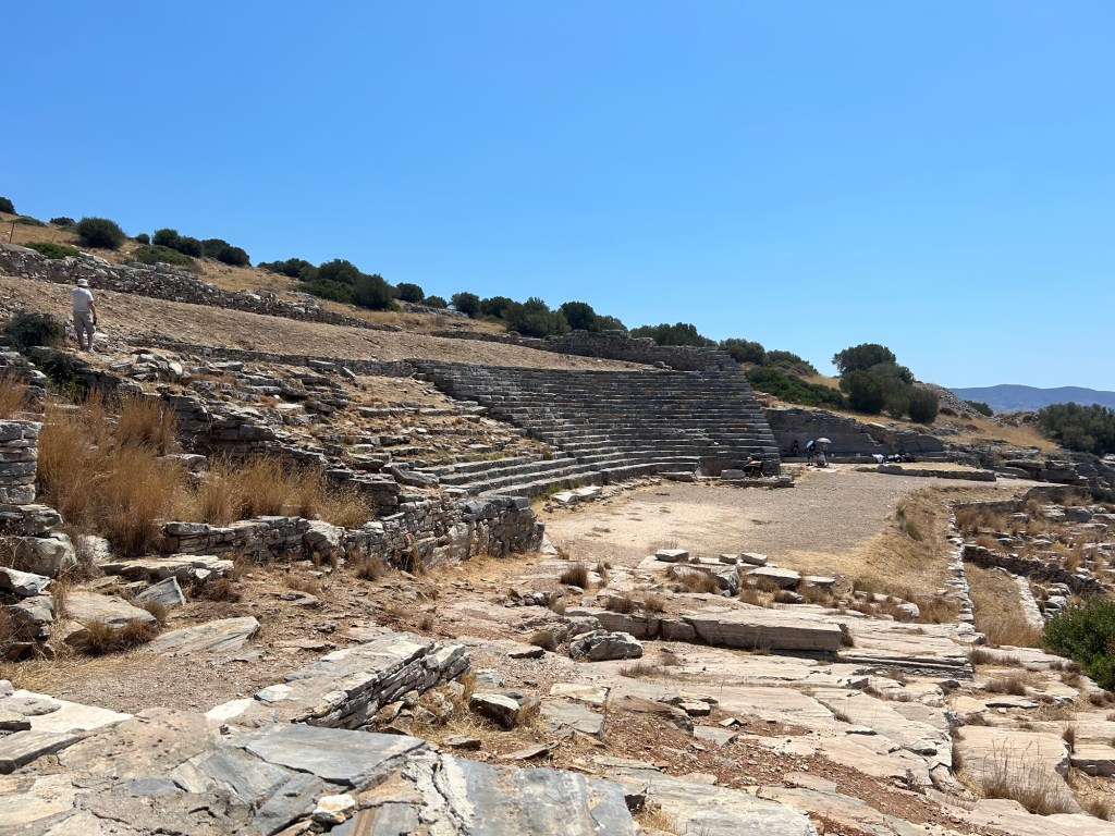 The building has twenty-one rows of seats, and there is even evidence of scaffolding at the top. It appears that perhaps twelve rows of wooden seating, constructed out of wood, would have loomed above. Next to it, it seems like there was a temple dedicated to Dionysus, which isn’t surprising since drama and theater was associated with him and his cult.