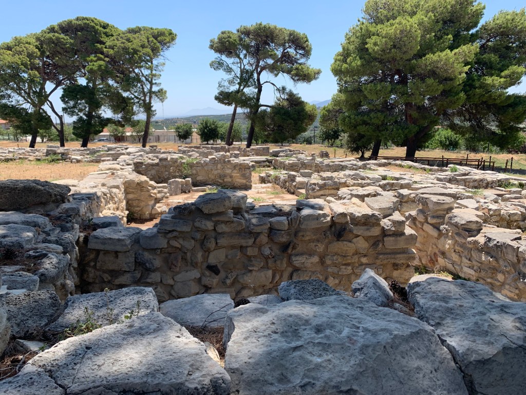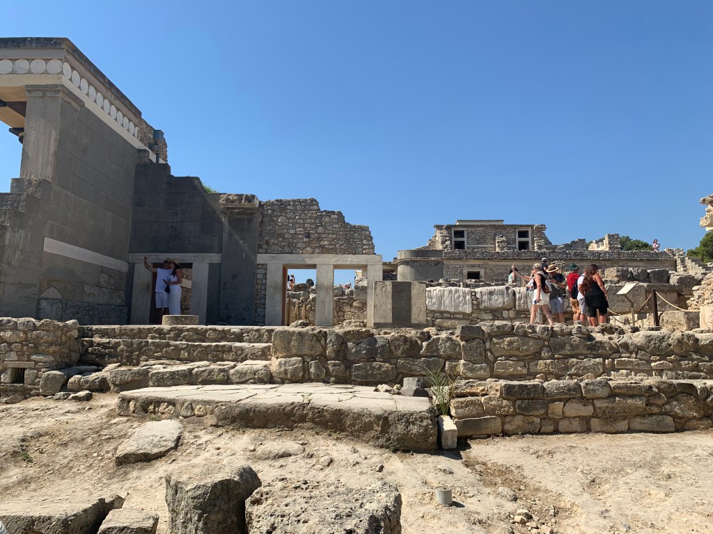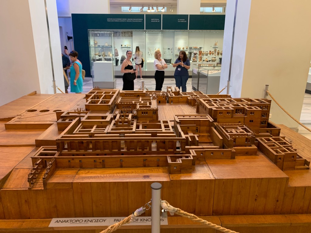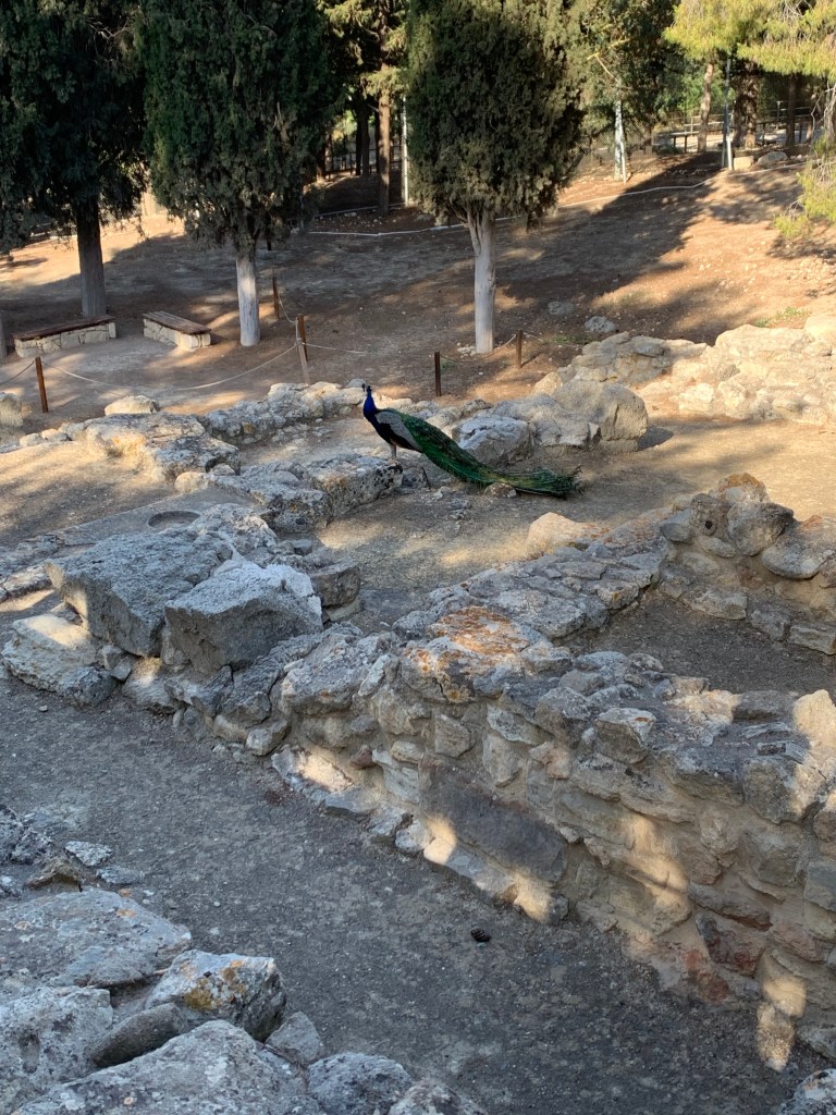 The morning started even earlier than usual, as with a knock on the door of our cabin before the sun rose, we were disembarking from the ferry and taking our first steps onto Crete. Our first stop for our day was the Minoan palace of Knossos where we were greeted by our guide for the site, Dr. Don Evely. His incredibly informative lectures were occasionally punctuated by the mocking cries of the peacocks, first introduced by Arthur Evans, that continue to populate the site to this day. One of the first things he told us was how little we really know about the Minoans, specifically how little information there is about the first two palatial phases of Knossos, spanning from 2100-1470 BCE, as there are no surviving Linear A or B texts from this period. Another aspect we were reminded about is that we know nothing about was the character of Minoan society. According to Dr. Evely, any attempt to characterize the Minoans is largely the result of projection by those doing so. It is no coincidence that the peaceful, nature-loving conception of the Minoans that is so widespread that even I have fallen prey to it was first propagated during the flower-power ’60s.