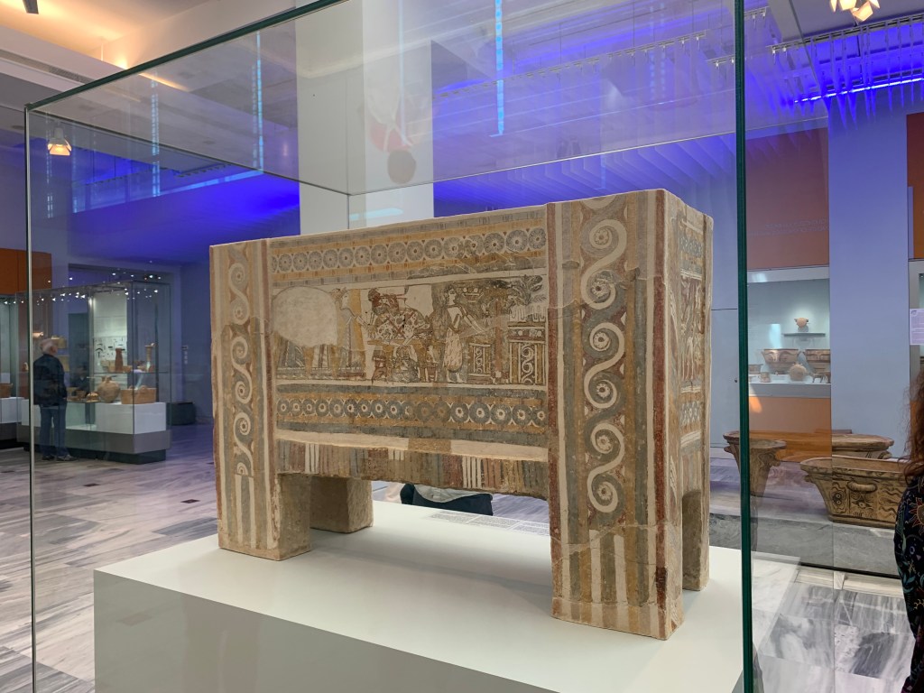 We ended the day at the Heraklion Museum of Archeology with Penelope’s excellent presentation on the Aghia Triada Sarcophagus. While the presentation was extremely well-researched and informative, the conclusion to be drawn about whether a funerary procession or a depiction of a Cretan god is being depicted on the decorations of the Sarcophagus is that with the information we have, there is simply no way to know. In archaeology, it is important to know the things we can, and accept the things we cannot.