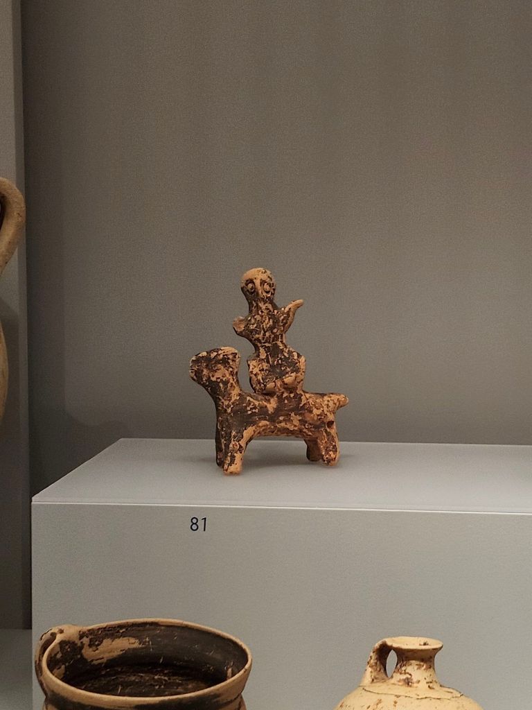 The artifacts at the museum were all very fascinating, but I was greatly affected by two artifacts, a child’s toy and a protective figure to help a child down to Hades. We don’t see a lot of children’s toys, so to see one right next to such a melancholic figure just sort of hurts. That or I’m just sensitive, who knows. You think of all the mothers and fathers who have had to bury their own child throughout all of history. Continuing with my never-ending comparison to modern society, children really seem to like toys that can roll, which I personally find very endearing.