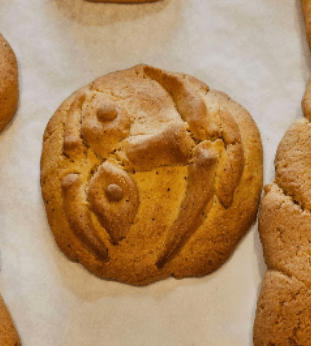 Isabelle and her baking creation, an orange cookie replica of the Agamemnon Mask (Zotos Brothers Biofarm)