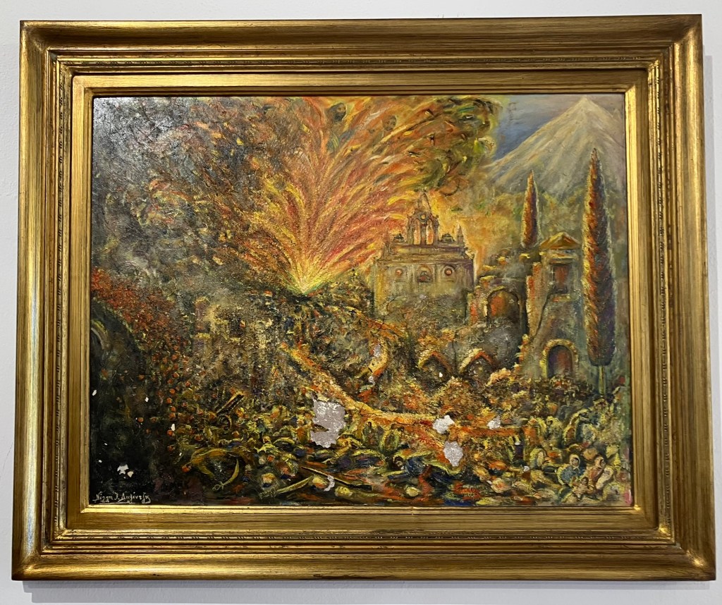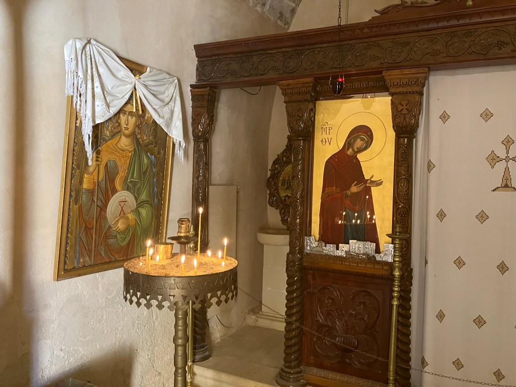 As archeologists, we spend much of our time treading through what might be not much more that foundations, trying to conjure up an image of what might have gone on there. The Arkadi monastery is one of those places that makes that mental image really easy. There, the past is heavy in the air, impossible to ignore, while you stand in the exact spot where hundreds of people lost their lives hundreds of years ago. As a light a candle for my grandfather in the chapel of Saint Arkadius, I can’t help but think of all the ways we memorialize what we’ve lost. Outside the gunpowder storeroom, some of my classmates discuss the illustrated display of the fateful event set up in memory of the victims. Upstairs in the art gallery, I’m struck by a painting of the monastery lit up like a firework, created by a local artist from Rethymnon.